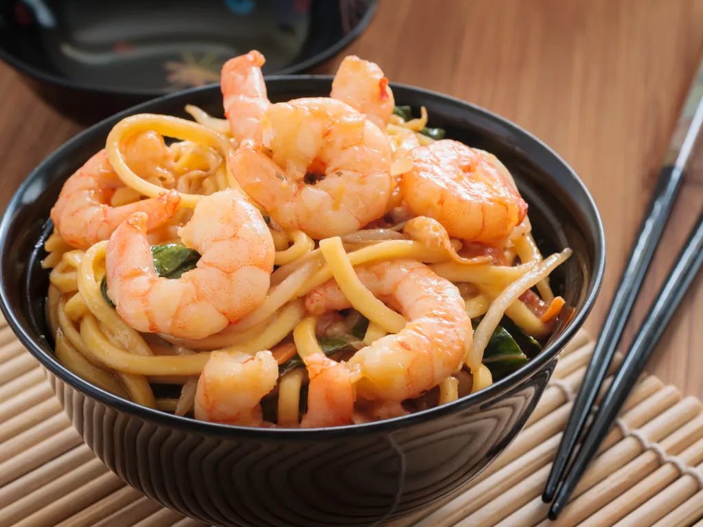 faire sauter les nouilles dans le reste d'huile très chaude en remuant. ajouter les légumes et les crevettes pour les réchauffer et servir vite.