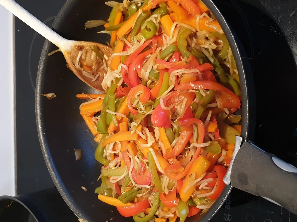 carotte, poivron rouge, poivron vert, champignon noir, oignon, vinaigre balsamique, germes de soja, sauce soja