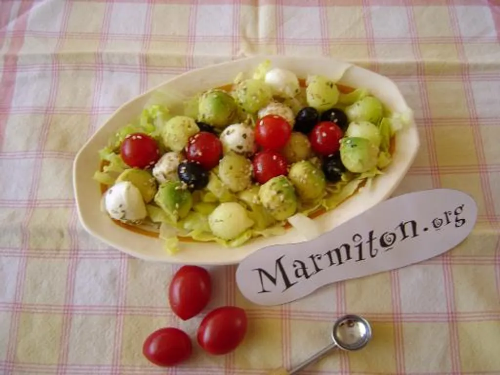 poivre, sel, melon, tomates cerise, sésame, huile d'olive, poivre, sel, avocat, mozzarella, olives noires, citron vert, fines herbes