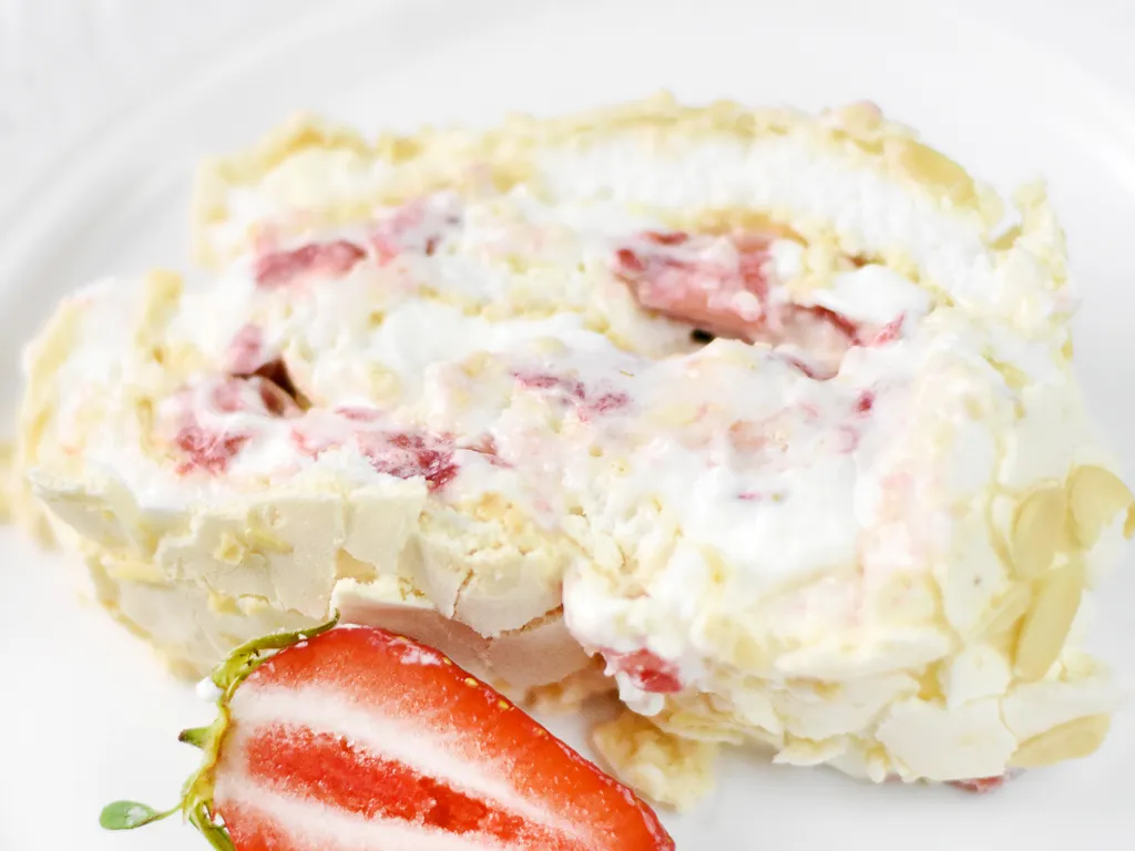 retirer le papier cuisson de la meringue et verser la crème fouettée dessus. puis y déposer les fraises coupées en petits morceaux. rouler ensuite l'ensemble en s'aidant du papier cuisson et entreposer au réfrigérateur au moins pendant 1 heure.