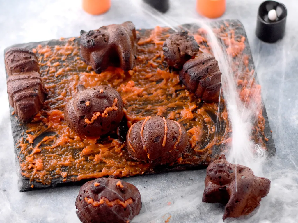 remplir les moules jusque la moitié et verser une cuillère d'orange curd au centre. couvrir avec un peu de préparation au chocolat.