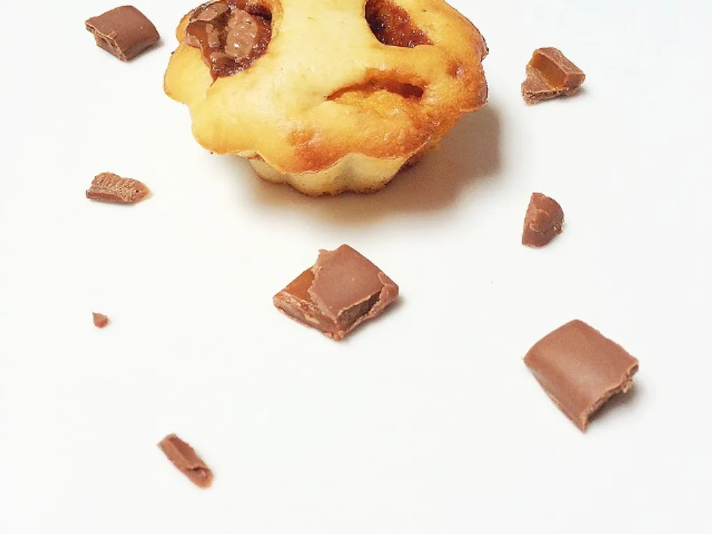 remplissez vos moules aux 1/3, coupez un chocolat "daim" en 4 morceaux, mettez 2 morceaux de daims dans les moules garnis de pâte, puis recouvrez du reste de pâte. finissez avec 2 morceaux de daims sur le dessus de chaque muffin, en les enfonçant légèrement.