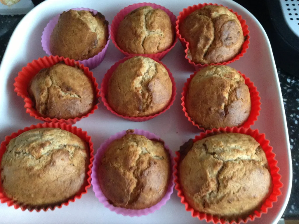2 bananes écrasées et/ou 60 g de muesli, 1 pomme coupée en petit dés et/ou des amandes éffilées, 100 gr de pépites de chocolat et/ou 1 poire coupé en dès, le jus d'1 citron et son zeste... brefff... laisser libre court à votre imagination...