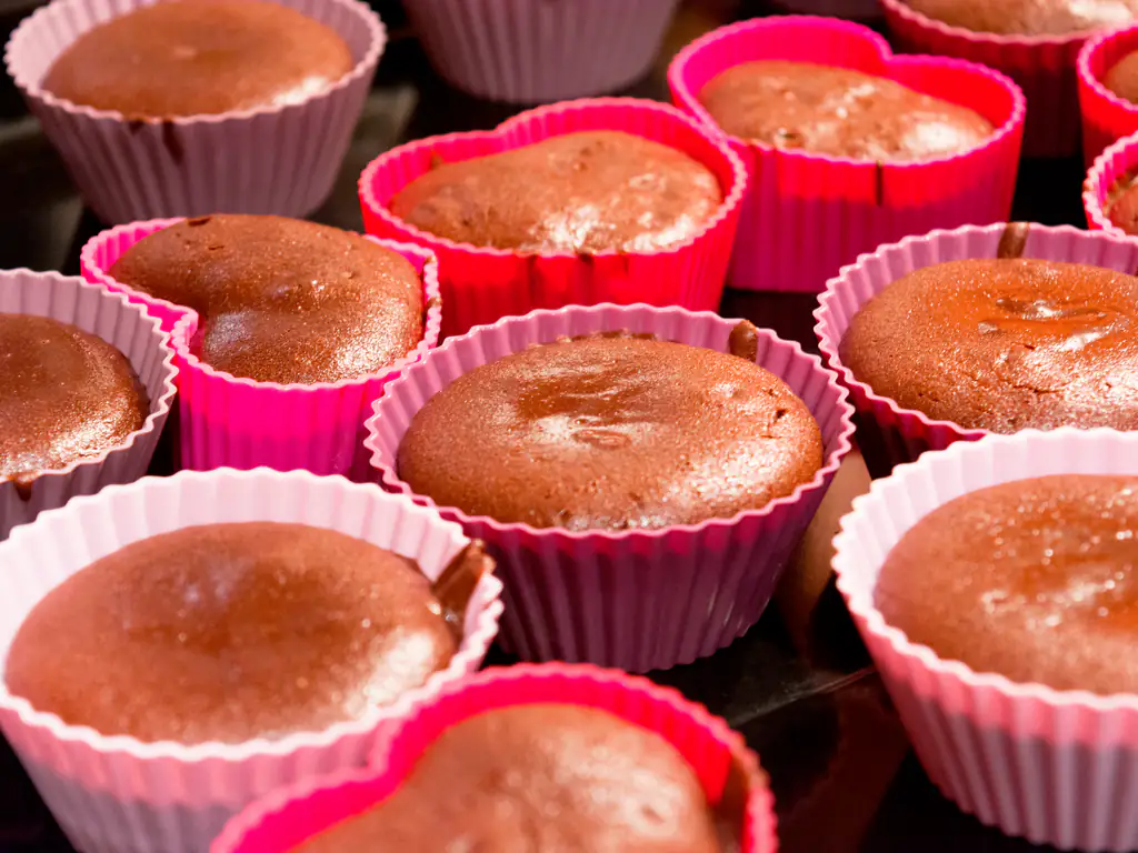remplir les moules au trois quarts et y placer au centre un carre de chocolat.