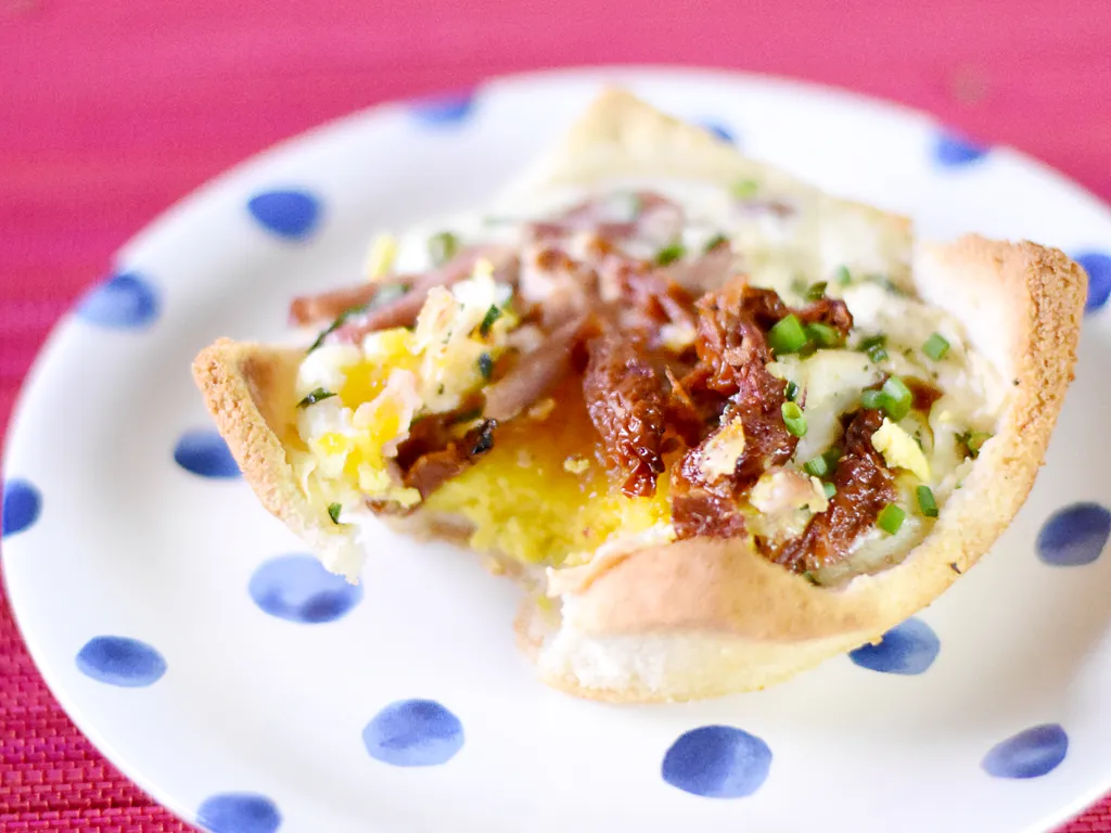 pain de mie, tomate séchée, crème fraîche, beurre, sel, poivre, oeuf, bacon, chèvre, ciboulette
