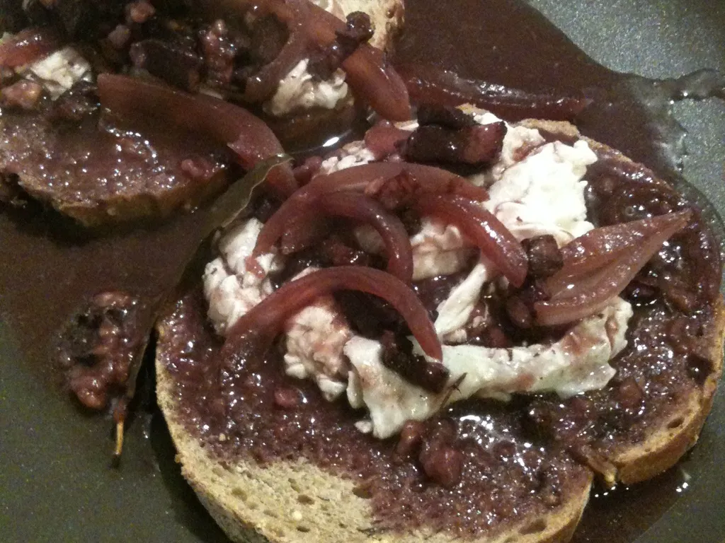 oignon, vin rouge, farine, thym, lardons fumés, laurier, vinaigre, beurre, oeuf, pain