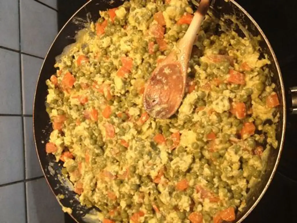 carotte, tomate, beurre, poivre, sel, oeuf, petits pois, oignon nouveau