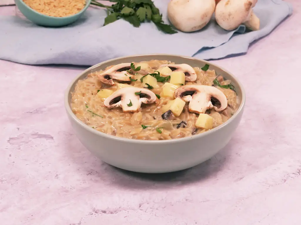 oignon, ail, champignon de paris, persil, bouillon, huile d'olive, tomme de savoie, orzo, crème liquide, sel et poivre