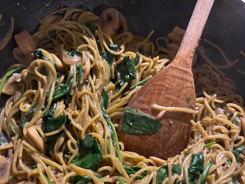 bouillon de légumes, ail, champignon de paris, huile d'olive, linguine, lait d'amande, pousses d'épinards, oignon rouge, sauce soja