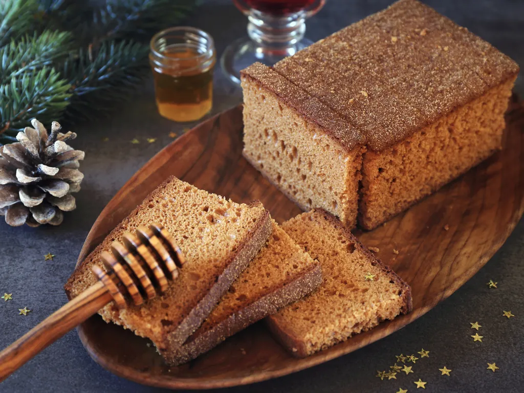 farine, levure, miel, cassonade, lait, sel, gingembre, cannelle, quatre-épices, gingembre confit, farine de seigle, oeuf
