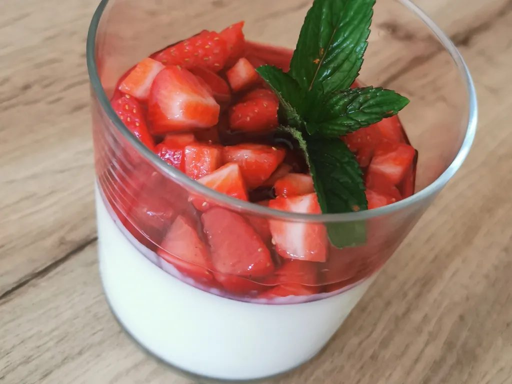 réaliser le dressage en versant un peu de sirop sur les panna cotta puis en ajoutant les fraises.