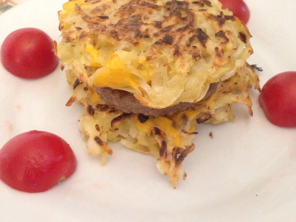 servir dans une assiette avec une galette un steak haché, deux rondelle de tomate et la deuxième galette garnie de fromage.