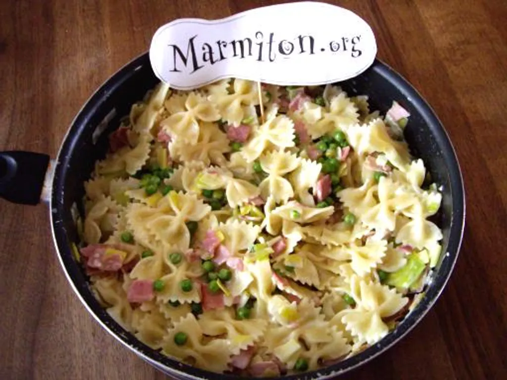égoutter les pâtes et les petits pois, les ajouter à la sauce au poireaux et au bacon ; remuer pendant 2 min.