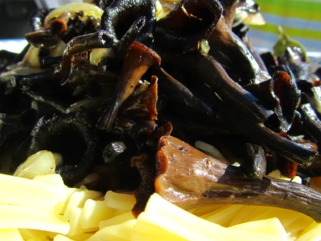 pâtes, huile d'olive, champignon, ail, oignon, origan, poivre, sel