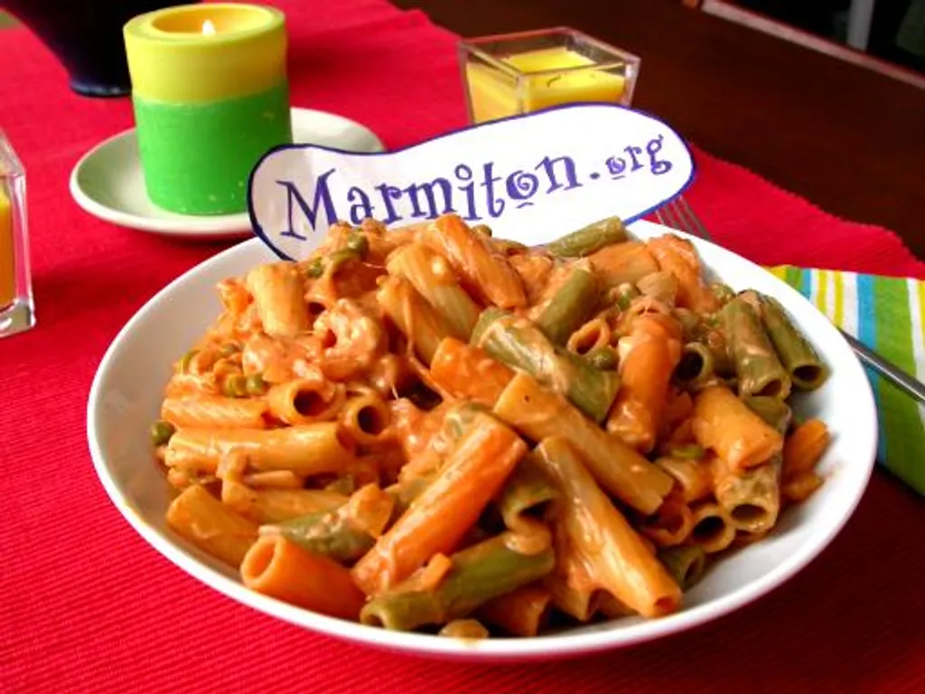 concentré de tomates, oignon, fromage râpé, poivre, sel, pâtes tricolores, petits pois, brique