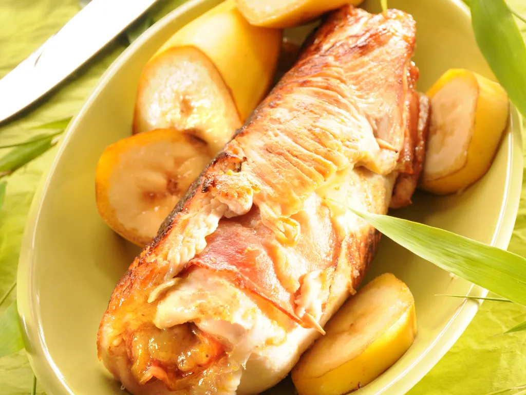 banane, oignon, rhum, poivre, curry, escalope de dinde, jambon cru, confiture de banane, crème liquide, ficelle