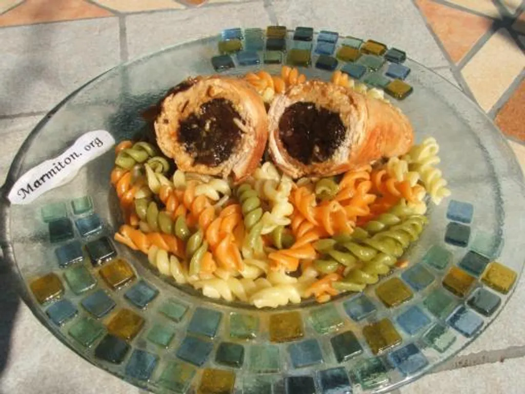 dénoyauter 8 pruneaux, déposer 2 pruneaux sur chaque escalope, les rouler et les ficeler.