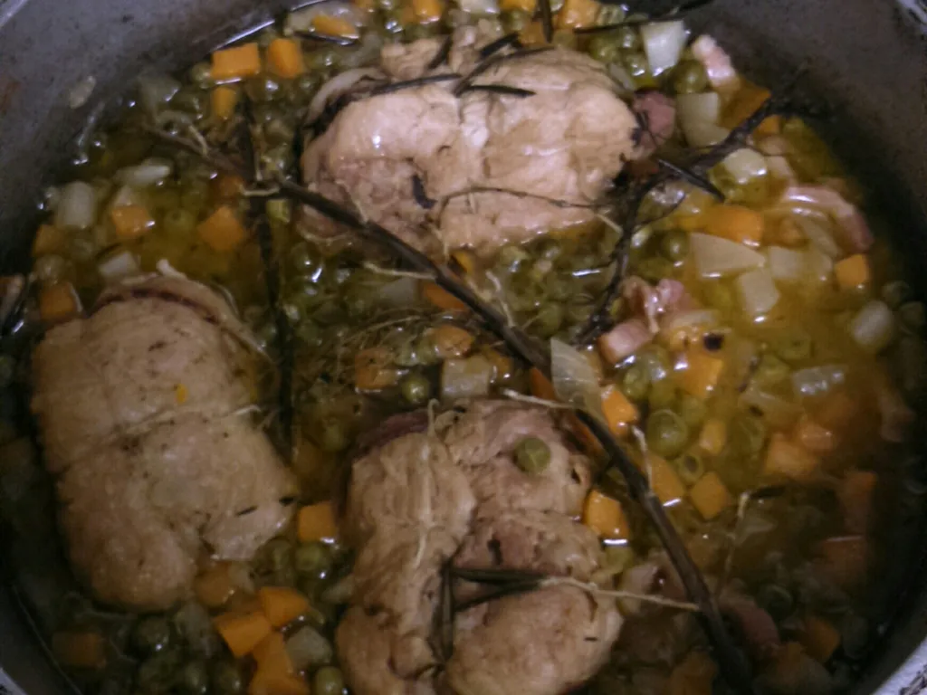 oignon, carotte, lardons, bouquet garni, huile, poivre, sel, paupiette de veau, petits pois, navet