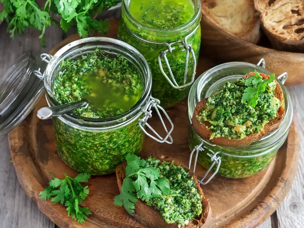 coriandre, ail, amandes, huile d'olive, sel, poivre