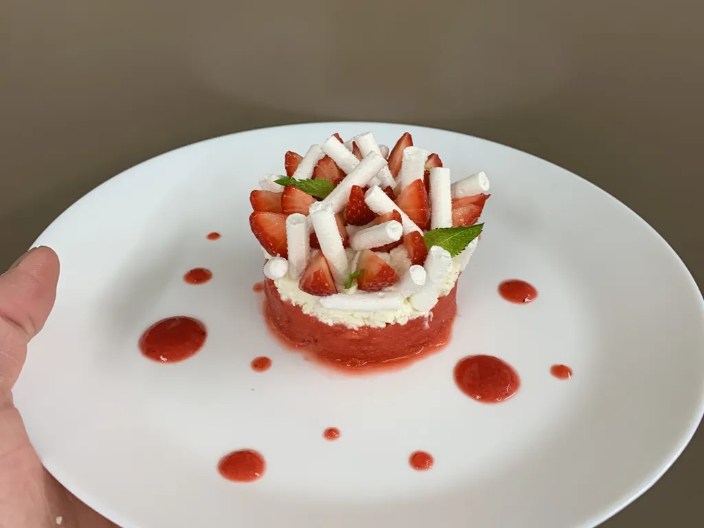 disposer ensuite les tiges de meringue cuites entre les fraises et de façon aléatoire. déposer quelques feuilles de menthe et répartir des touches de coulis autour du dessert déguster !