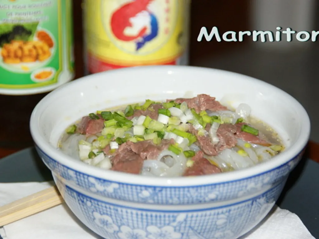 gingembre, oignon, sel, eau, clou de girofle, anis étoilé, coriandre, nouilles de riz, boeuf, ciboulette