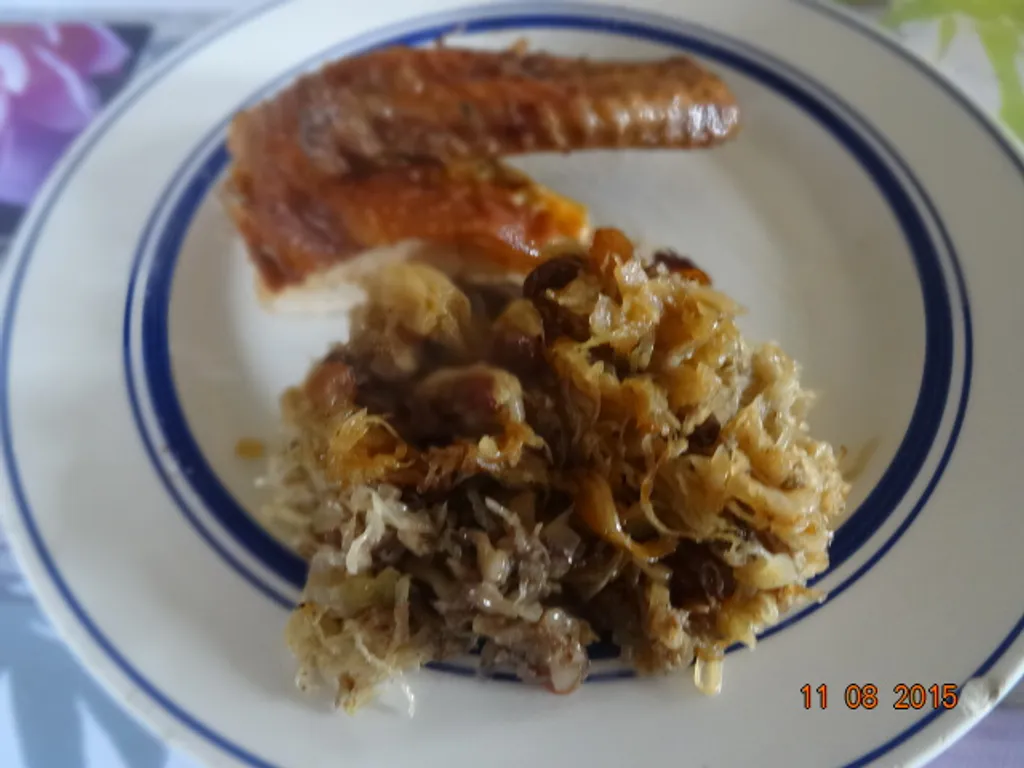 faire suer les oignons dans la graisse de canard, ajouter la choucroute bien essorée, cuire 10 mn sur feu doux en remuant. verser le cidre et les raisins secs, le sel, poivre, laurier et girofle. cuire 15 mn laisser refroidir.