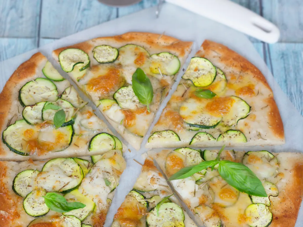 courgette, romarin, pâte à pizza, mozzarella