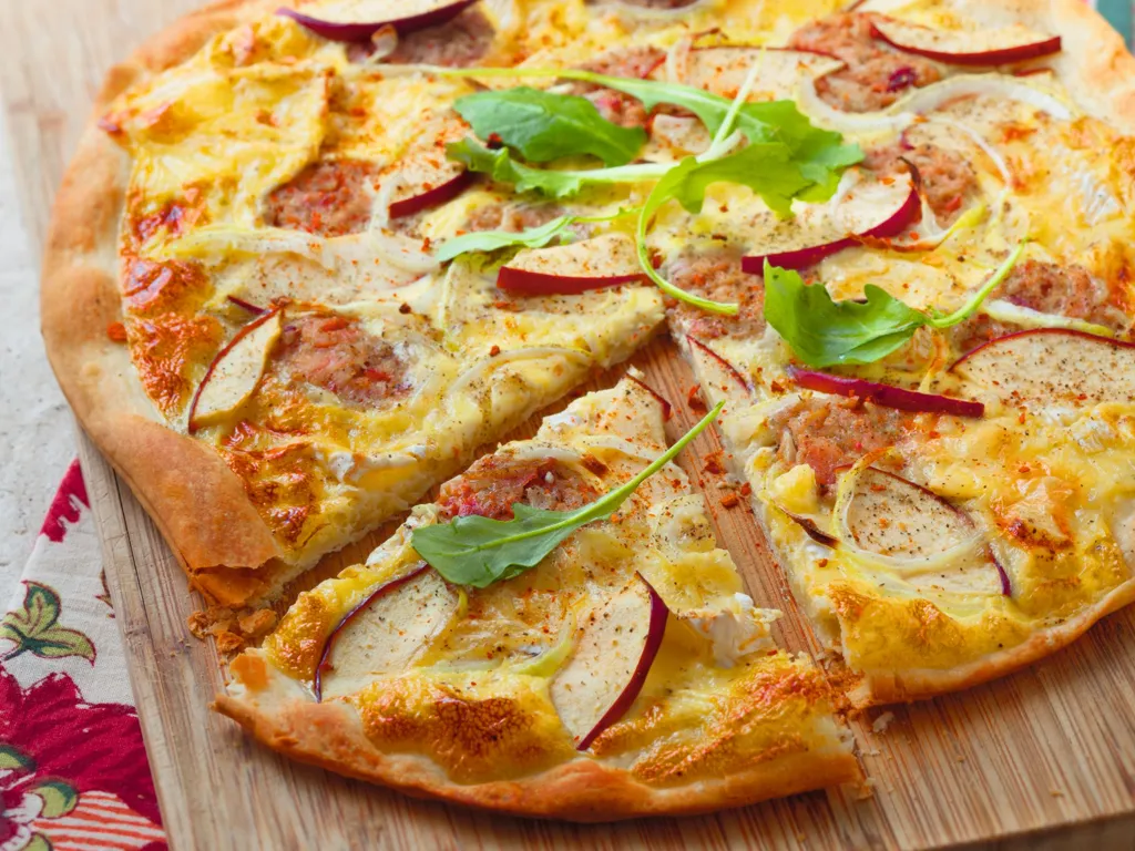 oignon, pomme, poivre, pâte à pizza, andouillette, camembert, crème liquide, oeuf