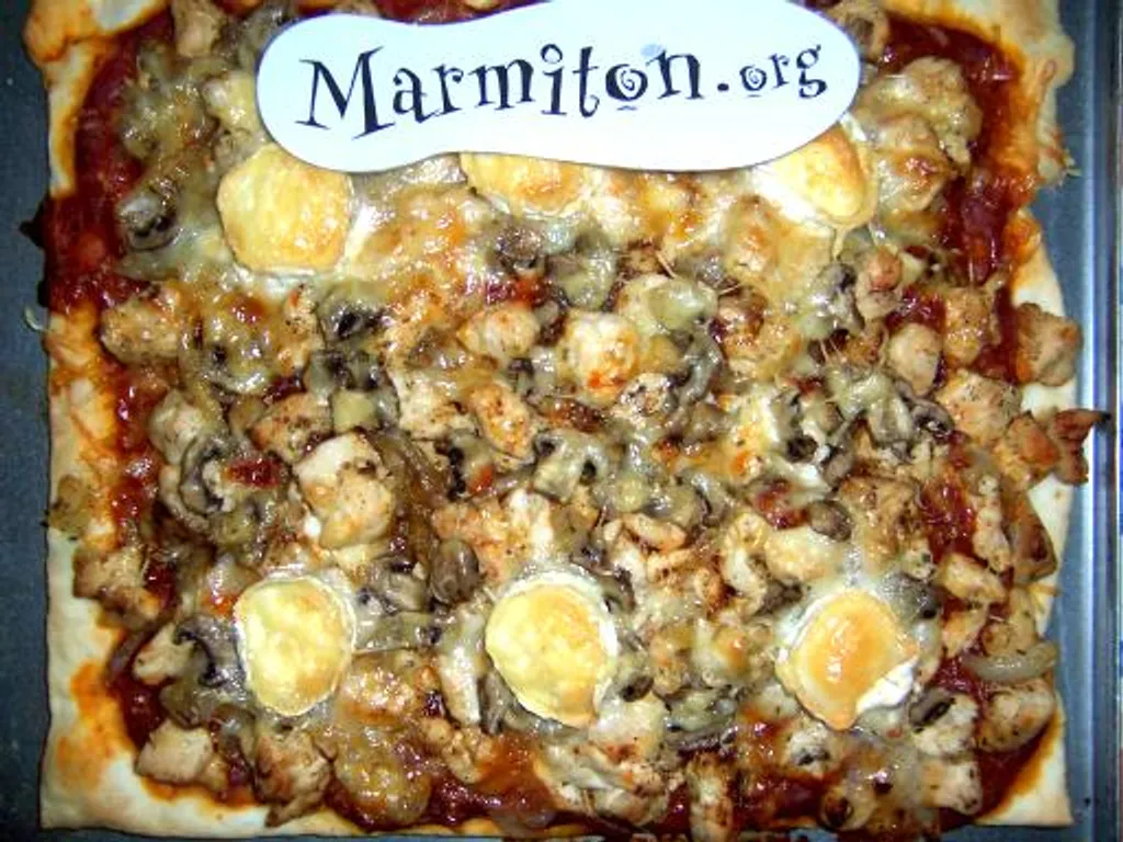 oignon, vin blanc, gruyère râpé, poivron vert, huile, pâte à pizza, escalope de poulet, coulis de tomate, épices pour pizza, champignon frais, chèvre