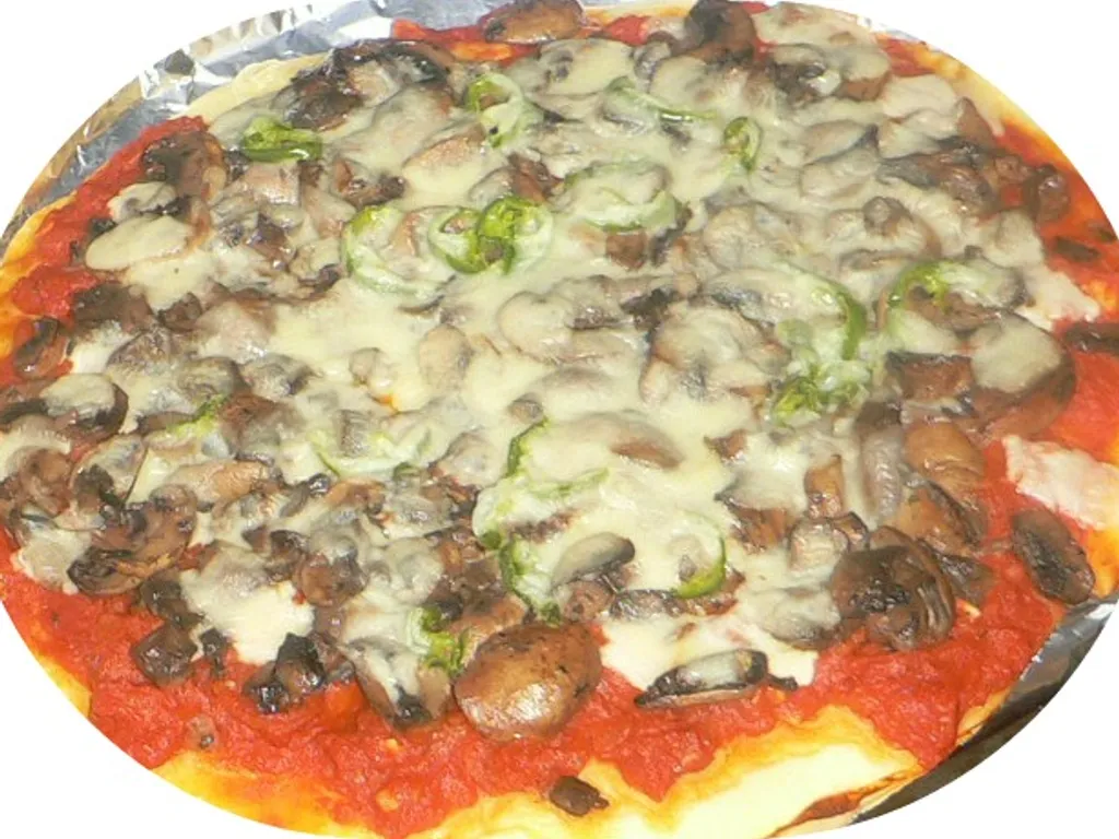 champignon de paris, poivron vert, tomate, oignon, ail, bouquet garni, huile d'olive, sucre, poivre, sel, origan, pâte à pizza, mozzarella