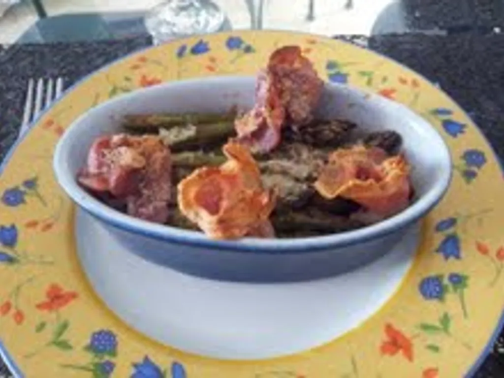 répartir les asperges dans 4 mini-cocottes ou à défaut un plat à gratin.