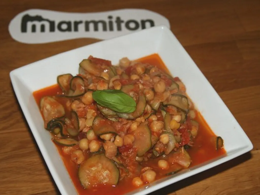 pois chiches, oignon, courgette, poivre, sel, piment, ail, basilic, tomates pelées, thon