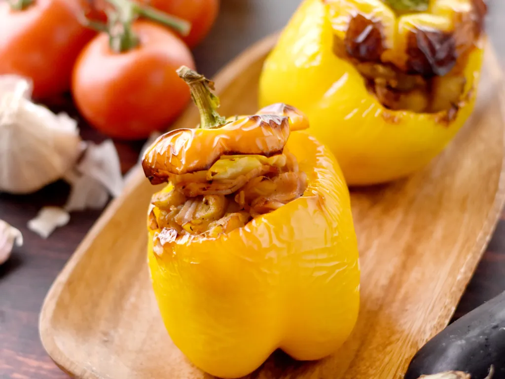 farcir les poivrons du mélange de légumes et les placer dans un plat allant au four.