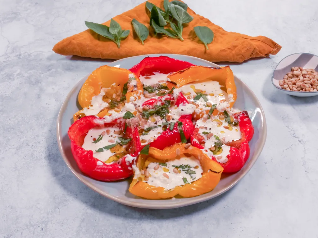 pour terminer, passer au dressage. servir vos poivrons dans un plat, ajouter la crème de mozzarella, la vinaigrette et les pignons torréfiés.