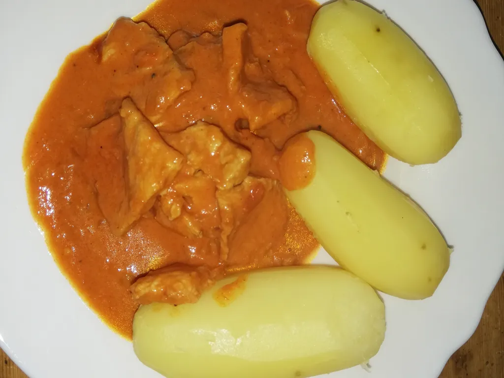cumin, paprika, ail, purée de tomate, bouillon, oignon, beurre, crème fraîche, fécule de maïs, poivre, sel, porc, margarine, saindoux