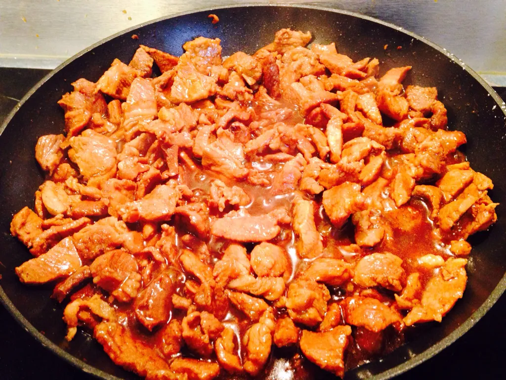 dans une cocotte, faire revenir rapidement le porc coupé en morceaux(plus ou moins gros suivant vos goût).