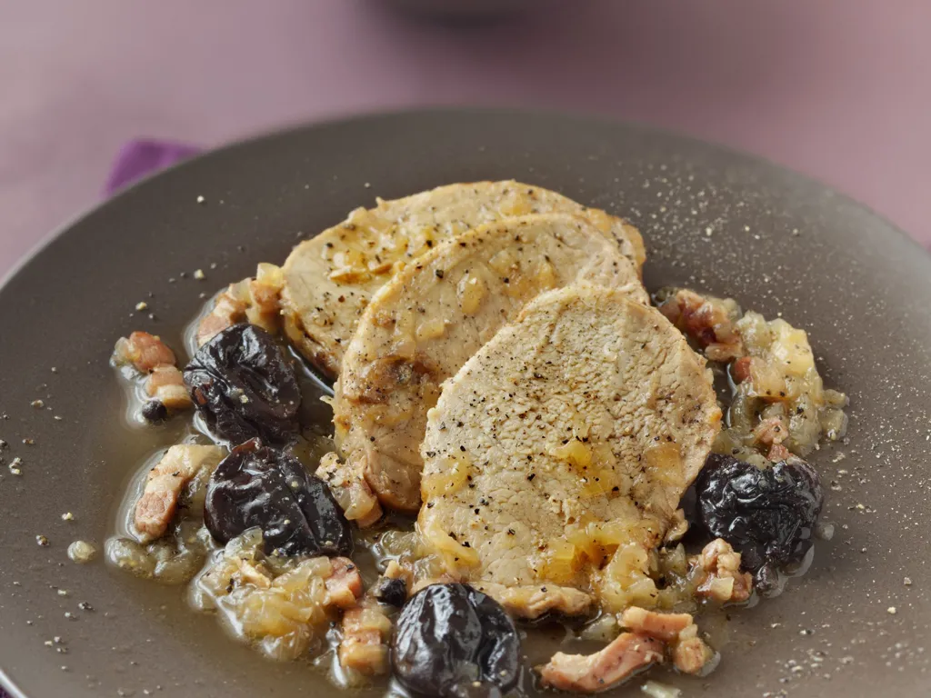 pruneau, oignon, beurre, bouillon de volaille, rôti de porc, lardons fumés