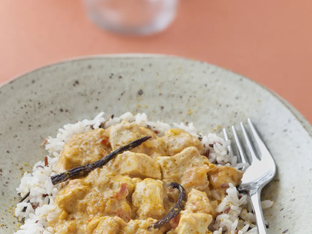 tomate, oignon, ail, gingembre, noix de coco rapée, vanille, beurre, curry, poivre, sel, blanc de poulet, citron vert, lait de coco