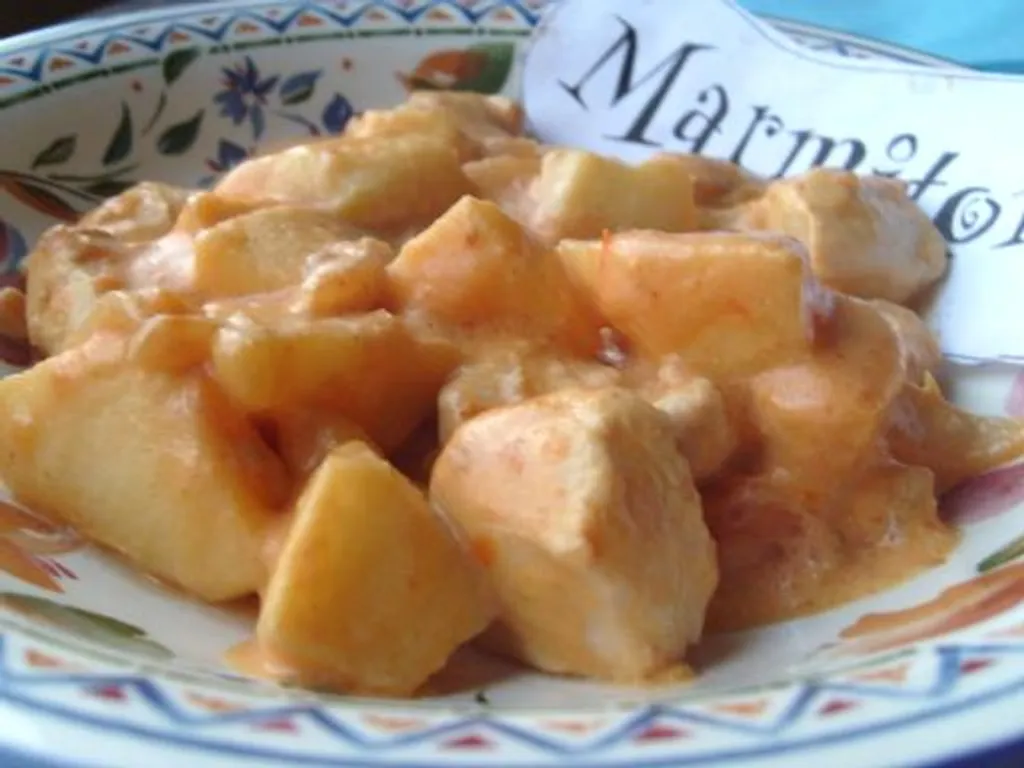 faites chauffer l'huile dans une poêle et faites-y revenir l'oignon, la gousse d'ail et les dés de poulet. ajoutez la chair de tomates, la pomme coupée en dés et la crème. salez, poivrez, ajoutez le bouquet garni et le curry.