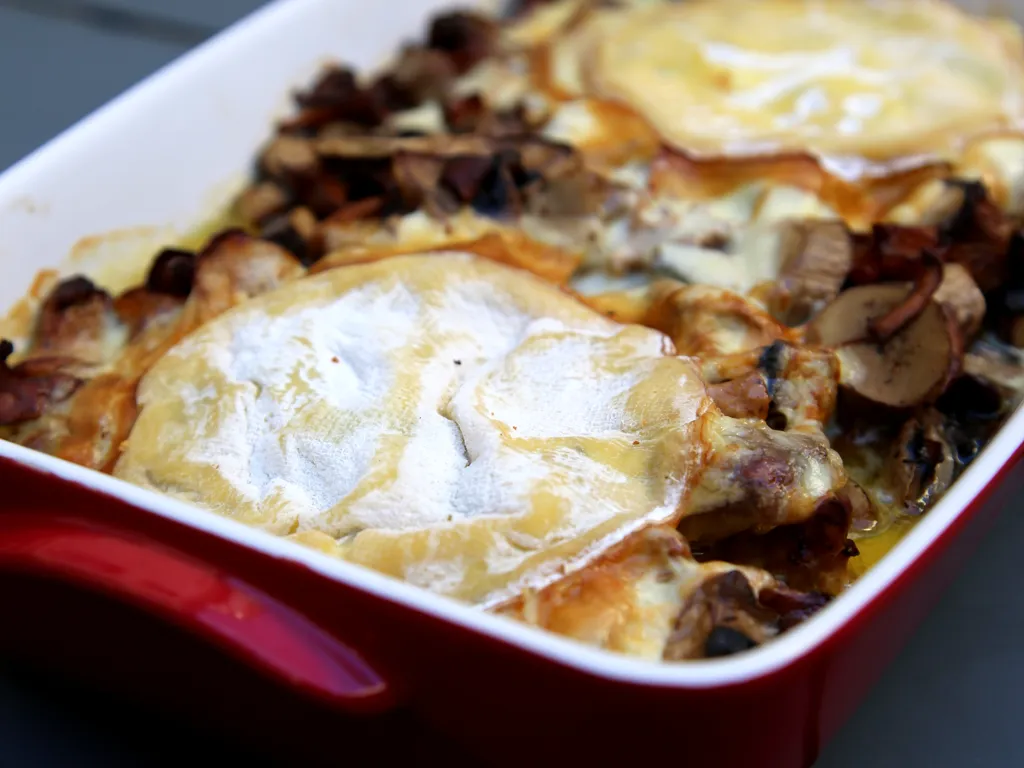 a la fin de la cuisson du poulet, ajouter les champignons dans le plat. sortir le mont-d'or de sa boite en bois, le couper en deux et le poser sur le plat.
