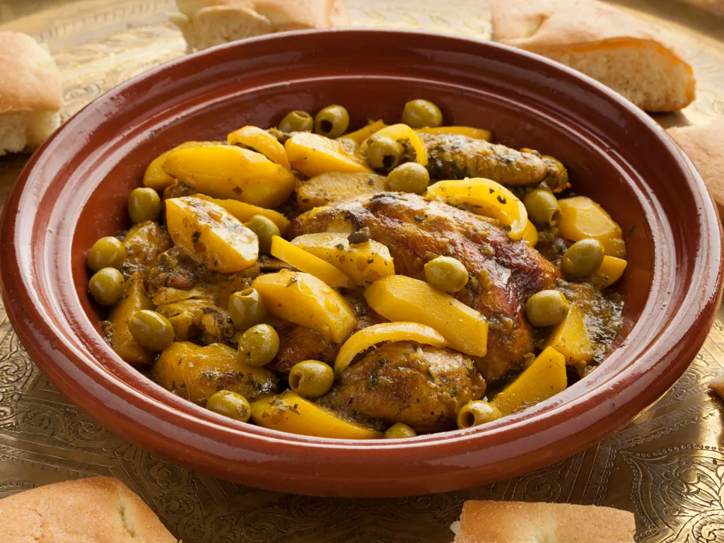 oignon, safran, poivre, cumin, piment de cayenne, concentré de tomates, eau, pomme de terre, semoule moyenne, huile de tournesol, beurre, poulet, olives vertes