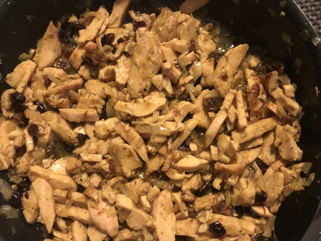 oignon jaune, curry, miel liquide, raisins secs, huile d'olive, amandes effilées, poivre, sel, coriandre, poulet