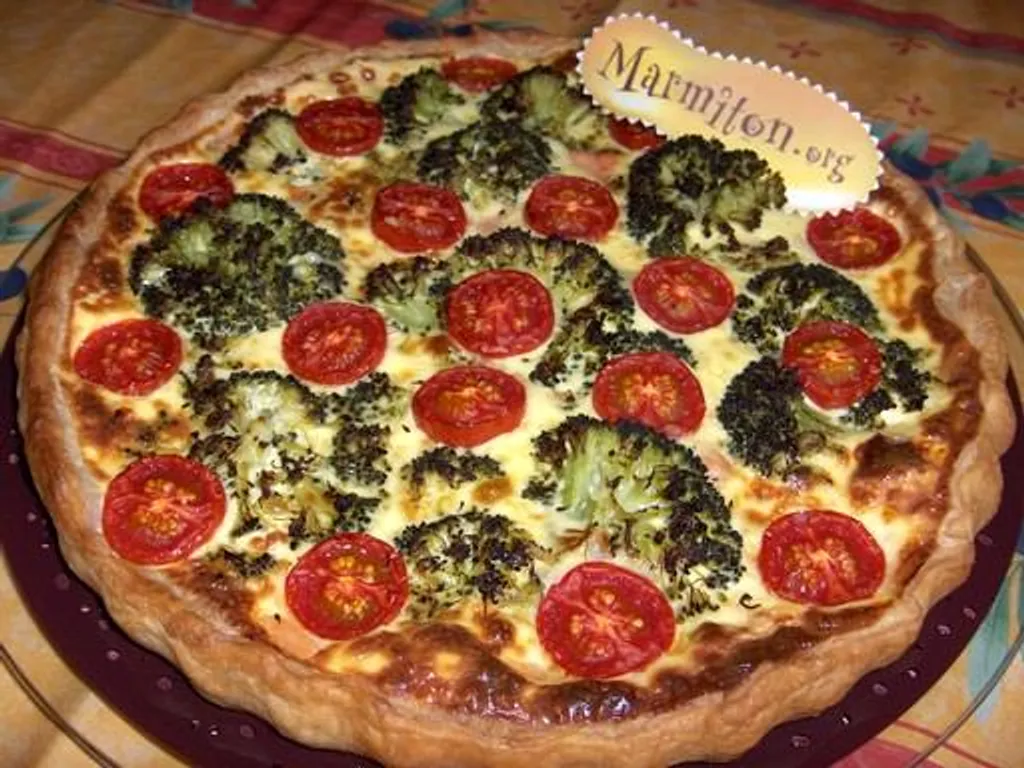 tomates cerise, crème fraîche, lait, poivre, sel, huile d'olive, pâte feuilletée, brocoli, saint-marcellin, oeuf