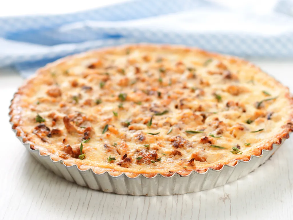 pâte brisée, gruyère râpé, champignon de paris, lardons, sel, poivre, muscade, huile d'olive, oeuf, jambon blanc, échalote, crème liquide