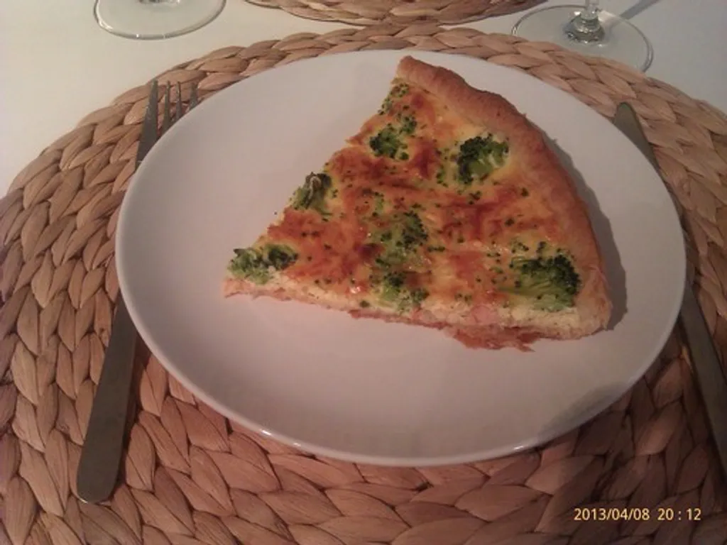mettre la pâte dans un moule à tarte ; y mettre les fleurettes de brocolis refroidis et les dés de saumon.