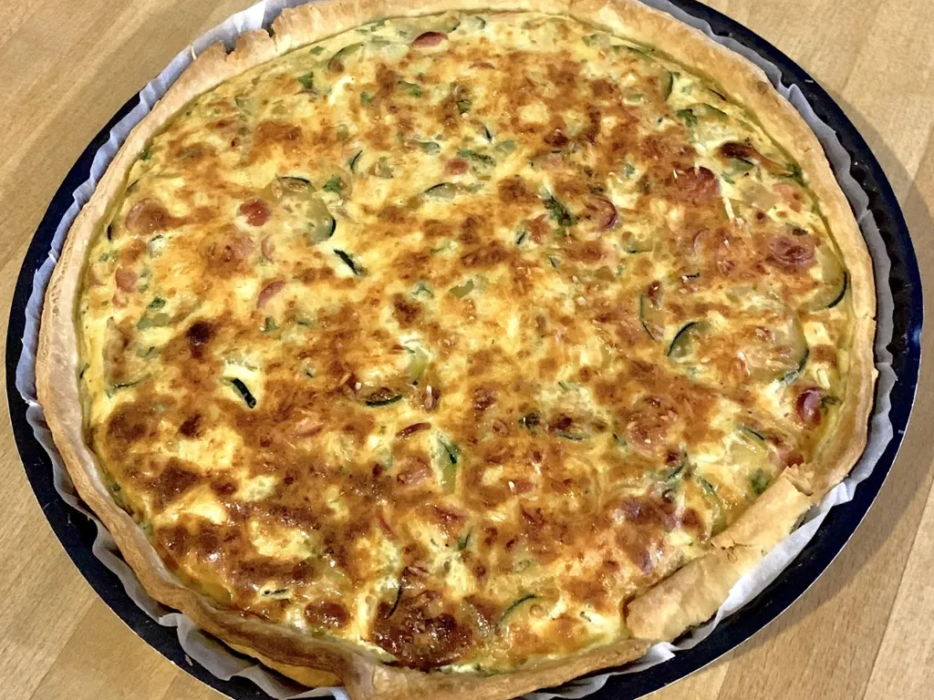 courgette, ail, persil, fromage râpé, pâte brisée, sel, poivre, oignon, knacki, oeuf, crème liquide