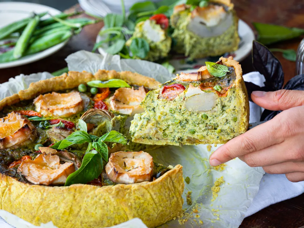 farine, curcuma, tomates cerise, oignon jaune, ail, crème fraîche, fromage râpé, fromage râpé, curcuma, thym, sel, poivre, beurre demi-sel, eau, épinards, petits pois, fond d'artichaut, basilic frais, oeuf, farine de pois chiches, chèvre