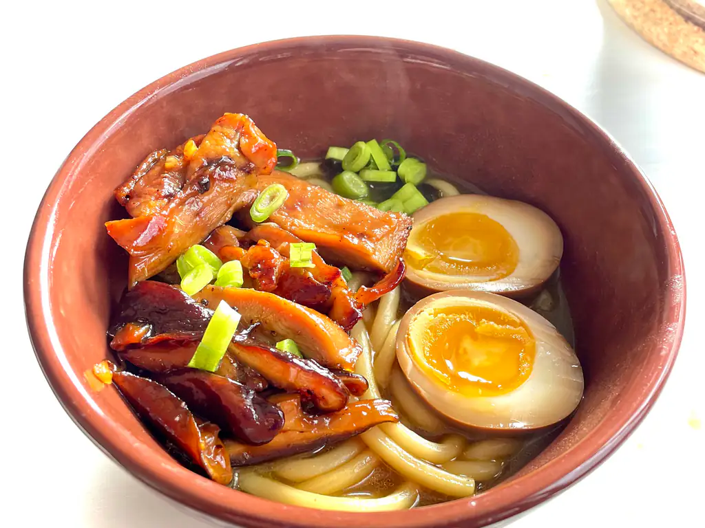 bouillon, nouilles udon, miel liquide, mirin, ail, gingembre en poudre, shiitaké, poulet, sauce soja, gingembre, mirin, oeuf, sauce soja, curry, poireau, ail, poivre, oignon, gingembre, miso, poulet, algue séchée, oignon cébette