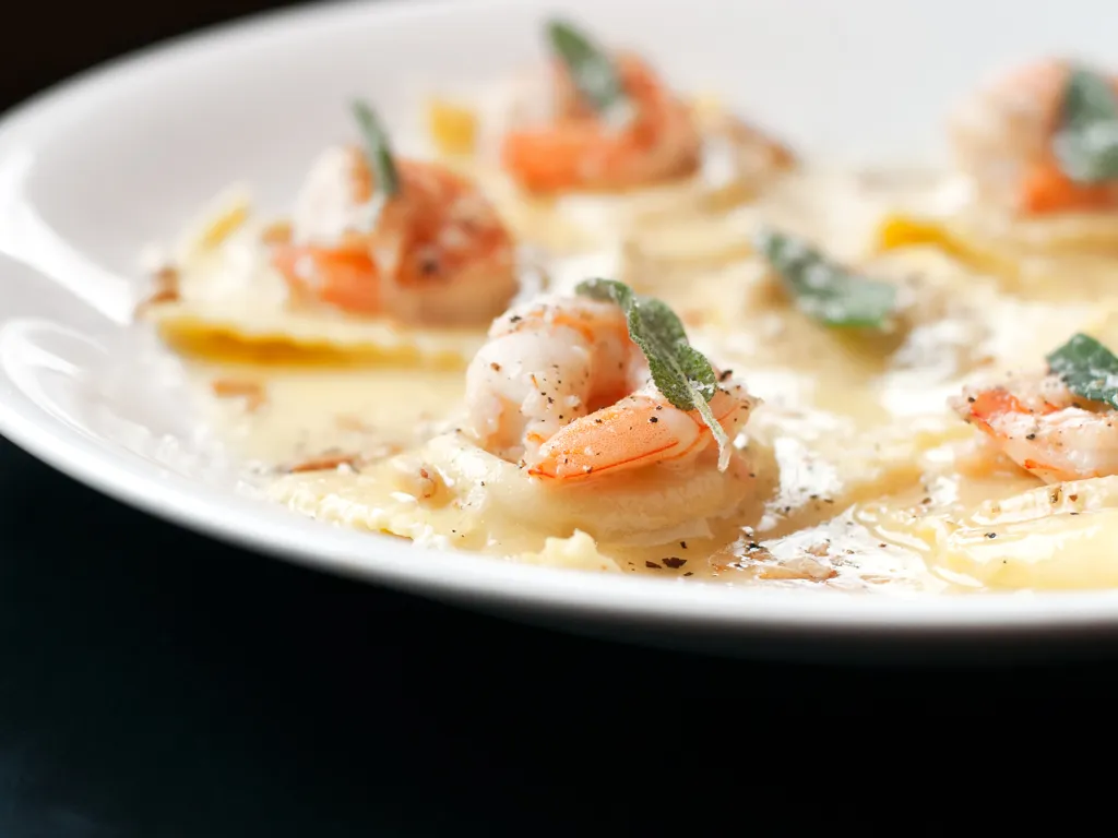 poireau, crème fraîche, ail, huile, poivre, sel, raviole, crevettes, boursin