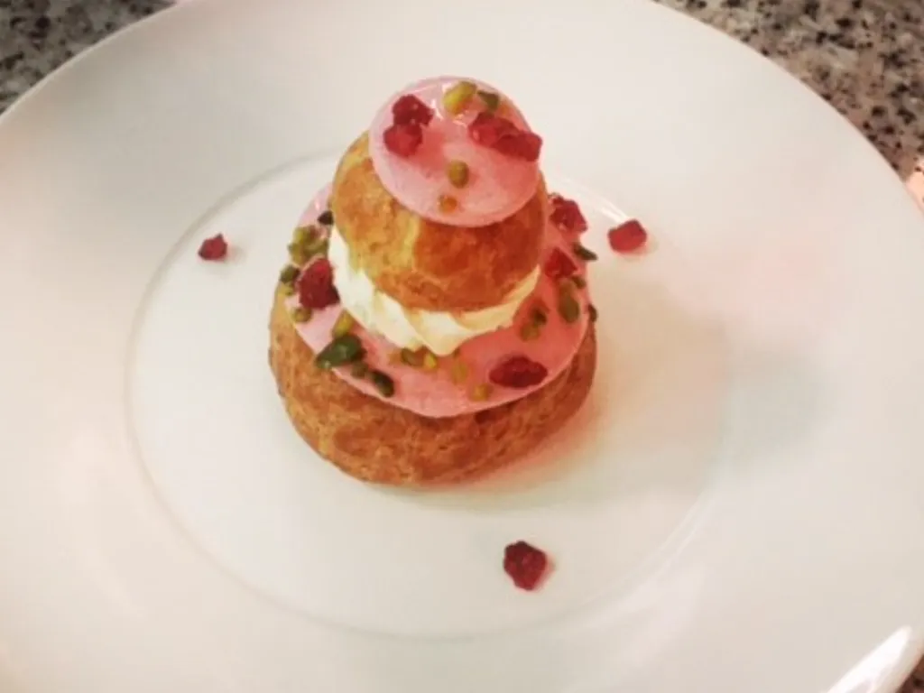 eau, beurre, sel, sucre, farine, oeuf, lait entier, oeuf, sucre en poudre, maïzena, framboises, eau de rose, pistaches, pâte d'amande